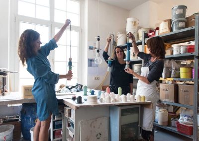 Ambrosz und Karin Santorso und Beate Seckauer, Inhaberin der Porzellanmanufaktur Neuzeughammer.